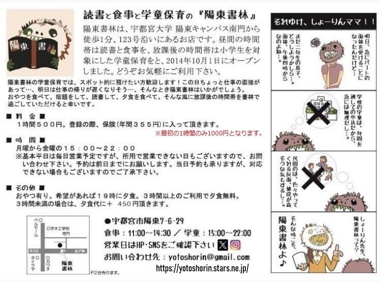 | 陽東書林は、宇都宮大学 陽東キャンパス南門から徒歩1分、123号沿いにあるお店です。昼間の時間帯は主に学生さん向けに読書と食事を、放課後の時間帯は小学生を対象にした学童保育をと、2014年10月1日にオープンしました。店内は、カウンター席、お座敷席を合わせて11席ほどございます。こじんまりしたお店でスタッフも少なく、お料理の提供にお時間がかかることもございますので、読書しながらお待ちいただければ…と思います。 |